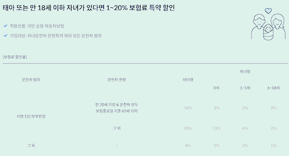 | 할인 대상 | 만 0세 이상 ~ 만 18세 이하 자녀를 둔 운전자 |