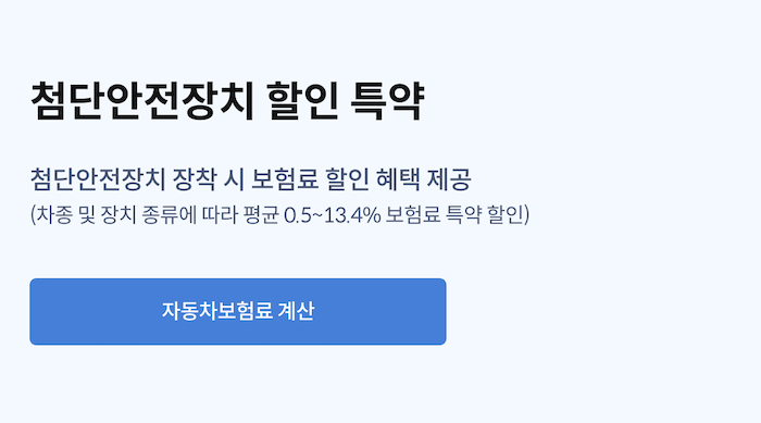 | 할인 대상 | 전방 충돌 방지 장치, 차선 이탈 경고 장치 등 첨단 안전 장치가 장착된 차량 |