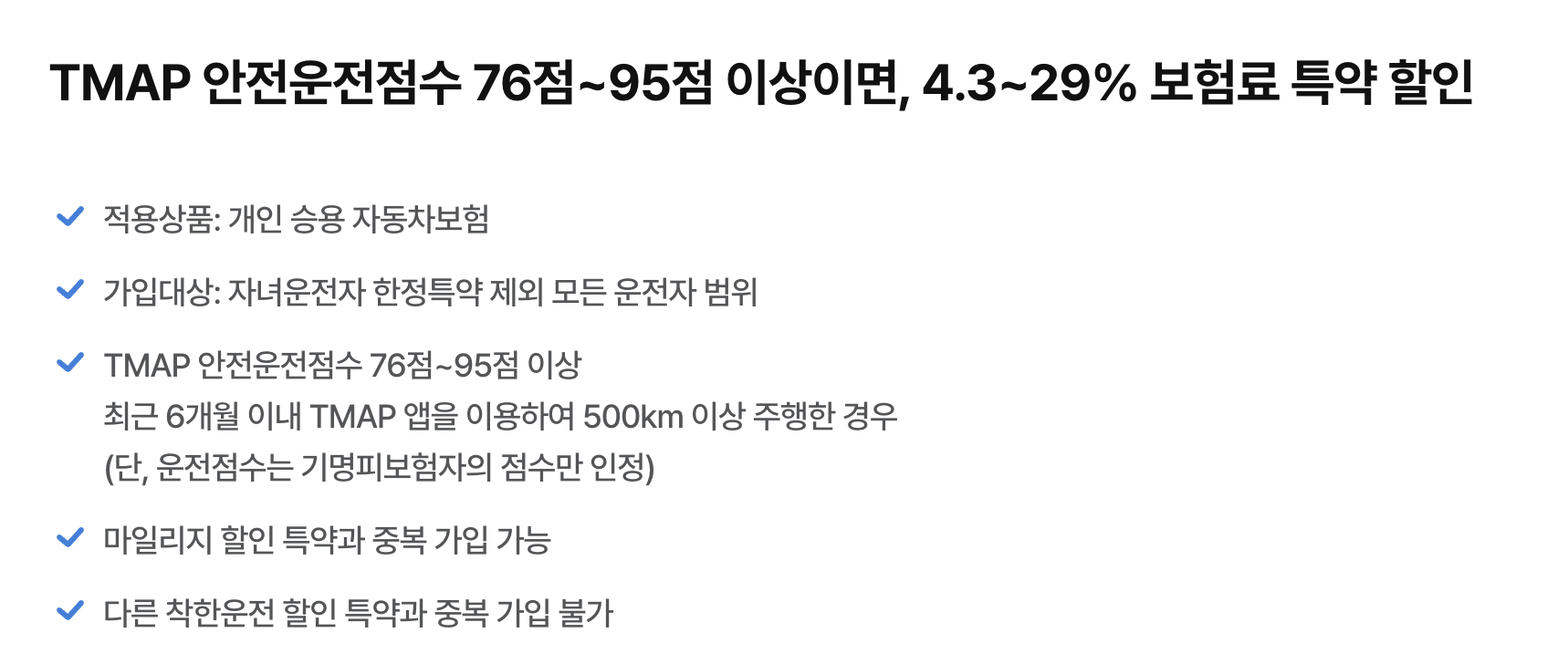 ✅ T맵 운전 점수 95점 이상이면 보험료 최대 29% 할인✅ 안전한 운전 습관 형성으로 사고 위험 감소
