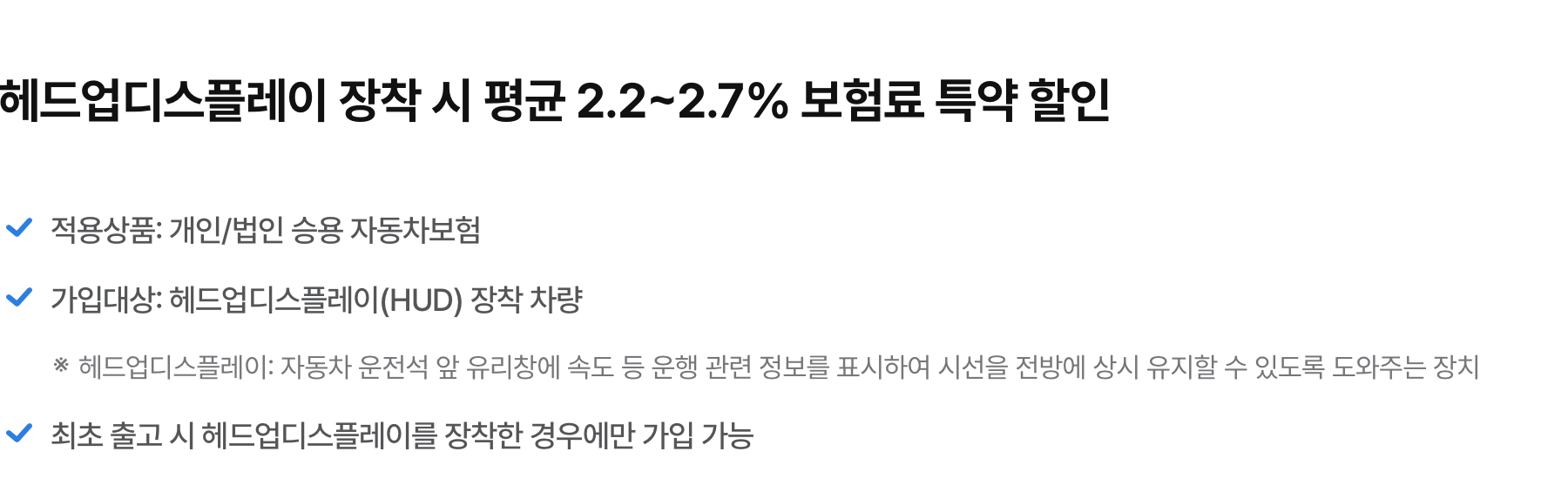 - HUD 기능이 장착된 차량은 최대 2.7% 보험료 할인 혜택 제공