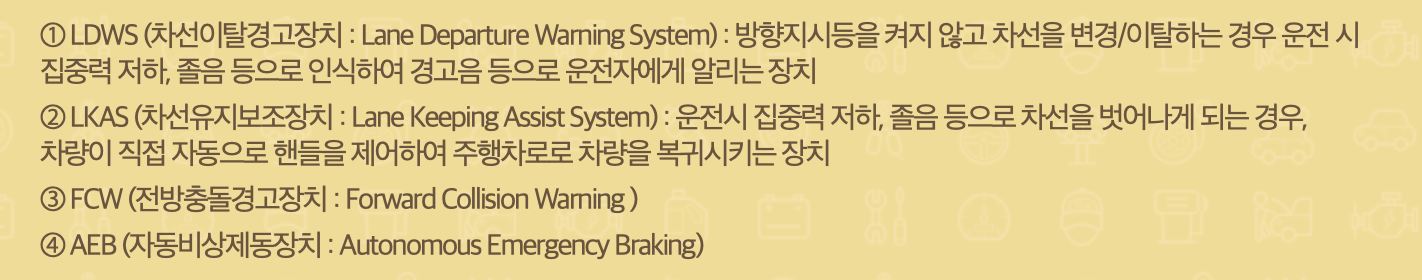 ① LDWS (차선이탈경고장치 : Lane Departure Warning System) : 방향지시등을 켜지 않고 차선을 변경/이탈하는 경우 운전 시