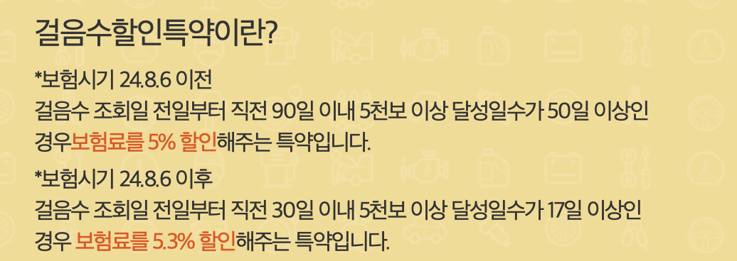 걸음수 할인특약은 가입자가 일정 기준 이상의 걸음수를 달성하면 자동차보험료를 할인해주는 특약입니다. 즉,